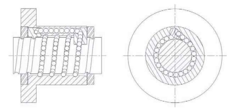 此種型式的螺帽是由鋼珠滾動(dòng)于絲桿和螺帽之間的滿槽而前進(jìn),再經(jīng)由循環(huán)器兩端之路徑做回流。 |